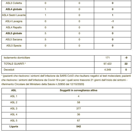 Ecco il bollettino di oggi con tutti i dati ufficiali inviati da Regione Liguria al ministero della Salute.