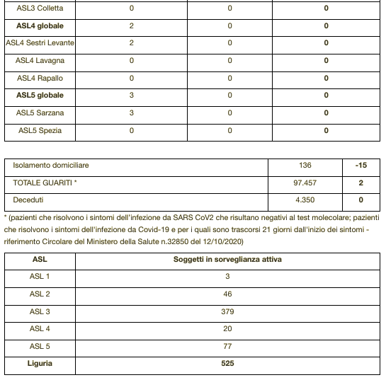 I flussi della Liguria sono stati allineati come indicato dall’Istituto superiore di sanità, considerando nei casi guariti, oltre ai pazienti che risultano negativi al test molecolare, anche quelli che risolvono i sintomi dell’infezione da Covid-19 e per i quali sono trascorsi 21 giorni dall’inizio dei sintomi previa valutazione di esperti clinici e microbiologi/virologi (riferimento Circolare del Ministero della Salute n. 32850 del 12/10/2020).