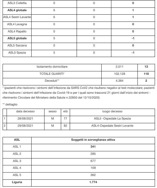 Genova, 30 agosto. Sono 4.384 i morti con coronavirus con un aumento rispetto a quanto comunicato ieri da Regione Liguria di due (maschi di 77 e 82 anni deceduti il 28 e il 29 agosto agli ospedali della Spezia e di Sestri Levante).