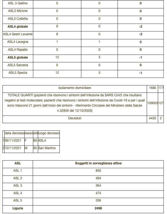 Sono 4.435 i morti con coronavirus con un aumento rispetto a quanto comunicato ieri da Regione Liguria di due (femmina di 89 anni deceduta il 9 novembre nel territorio dell’Asl 4 Chiavarese e maschio di 85 anni deceduto il 10 novembre al San Martino di Genova).