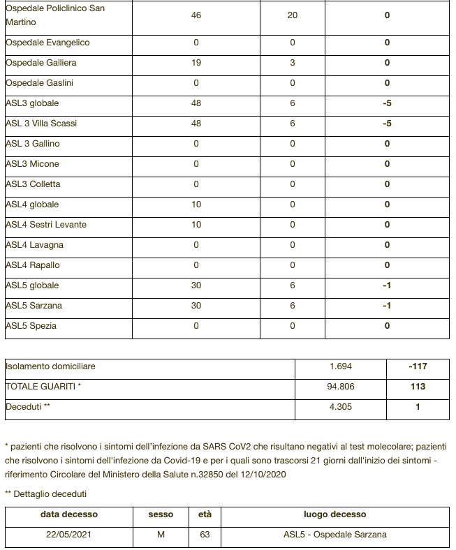 Genova, 23 maggio. Sono 4.305 i morti con coronavirus in Liguria, con un aumento rispetto a quanto comunicato ieri da Regione Liguria di uno (maschio di 63 anni deceduto l’altro ieri a Sarzana).