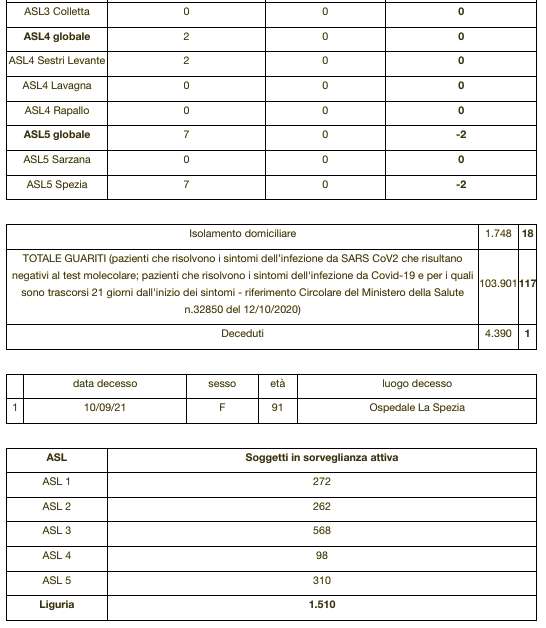 Genova, 11 settembre. Sono 4.390 i morti con coronavirus con un aumento rispetto a quanto comunicato ieri da Regione Liguria di uno (femmina di 91 anni deceduta il 10 settembre all’ospedale della Spezia).