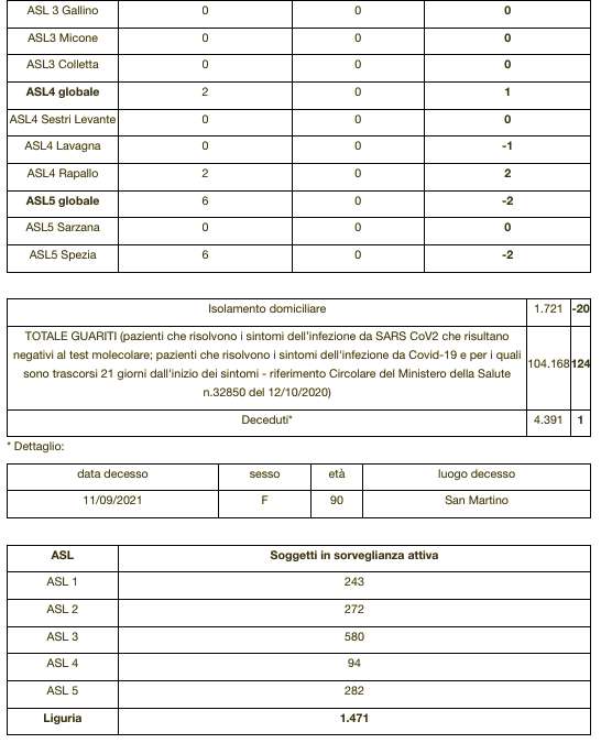 Ecco il bollettino di oggi con tutti i dati ufficiali della Regione Liguria al ministero della Salute.