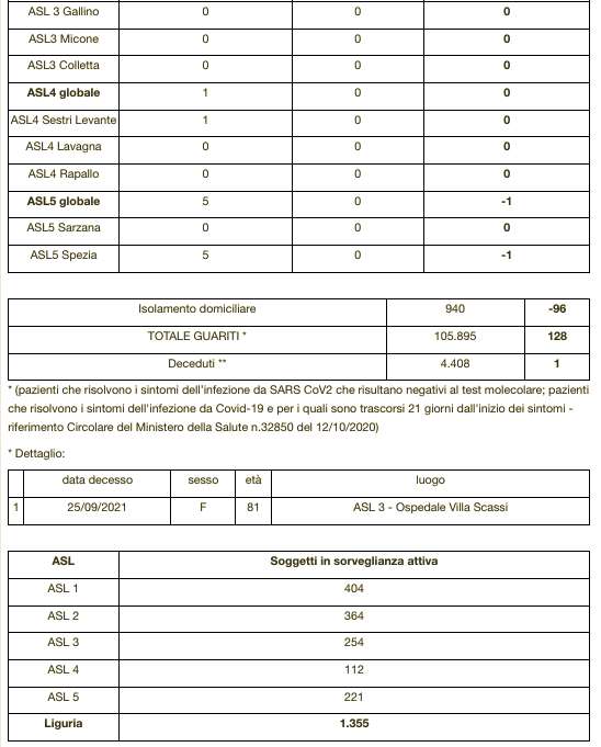 Ecco il bollettino di oggi con tutti i dati ufficiali della Regione Liguria al ministero della Salute.