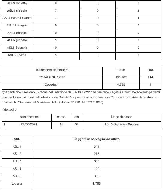 Genova, 31 agosto. Sono 4.385 i morti con coronavirus con un aumento rispetto a quanto comunicato ieri da Regione Liguria di uno (maschio di 87 anni deceduto il 27 agosto all’ospedale di Savona).