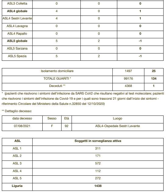 Genova, 8 agosto. Sono 4.368 i morti con coronavirus con un aumento rispetto a quanto comunicato ieri da Regione Liguria di uno (femmina di 92 anni deceduta il 7 agosto all’ospedale di Sestri Levante).