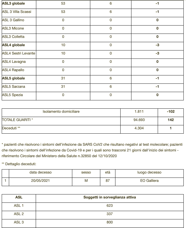 Genova, 22 maggio. Sono 4.304 i morti con coronavirus in Liguria, con un aumento rispetto a quanto comunicato ieri da Regione Liguria di uno (maschio di 87 anni deceduto l’altro ieri al Galliera).
