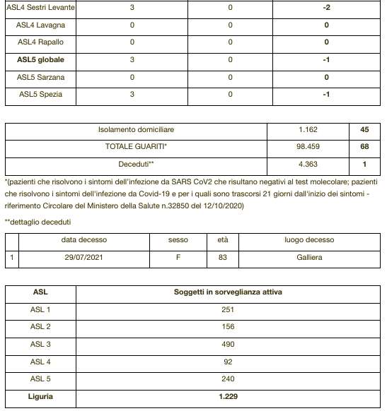 Sono 4.363 i morti con coronavirus con un aumento rispetto a quanto comunicato ieri da Regione Liguria di uno (femmina di 83 anni deceduta il 29 luglio al Galliera di Genova).