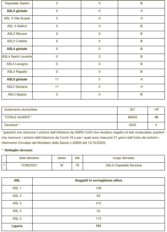 Sono 4.343 i morti con coronavirus con aumento rispetto a quanto comunicato ieri da Regione Liguria di uno (maschio 78enne deceduto ieri a Sarzana).
