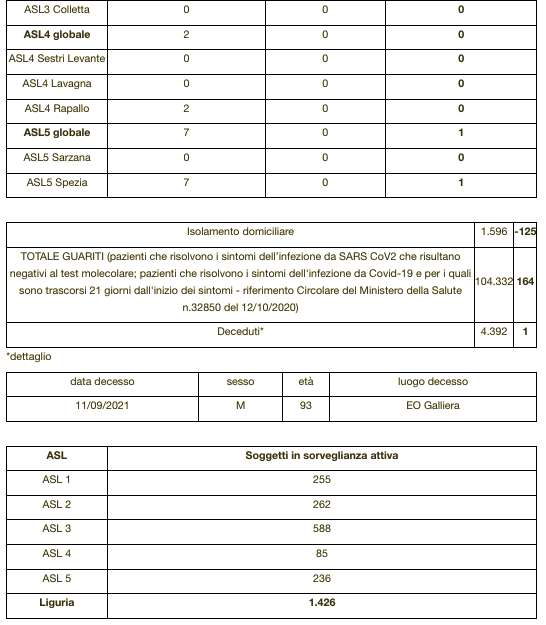 Genova, 14 settembre. Sono 4.392 i morti con coronavirus con un aumento rispetto a quanto comunicato ieri da Regione Liguria di uno (maschio di 93 anni deceduto l’undici settembre al Galliera di Genova).