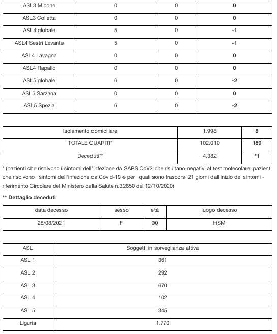 Genova, 29 agosto. Sono 4.382 i morti con coronavirus con un aumento rispetto a quanto comunicato ieri da Regione Liguria di uno (femmina di 90 anni deceduta il 28 agosto al San Martino di Genova).