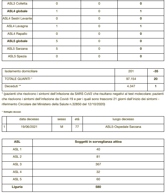 Sono 4.347 i morti con coronavirus con aumento rispetto a quanto comunicato ieri da Regione Liguria di uno (maschio di 77 anni deceduto il 19 giugno a Sarzana).
