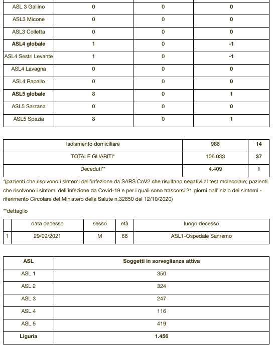 Genova, 30 settembre. Sono 4.409 i morti con coronavirus con un aumento rispetto a quanto comunicato ieri da Regione Liguria di uno (maschio di 66 anni deceduto il 29 settembre all’ospedale di Sanremo).
