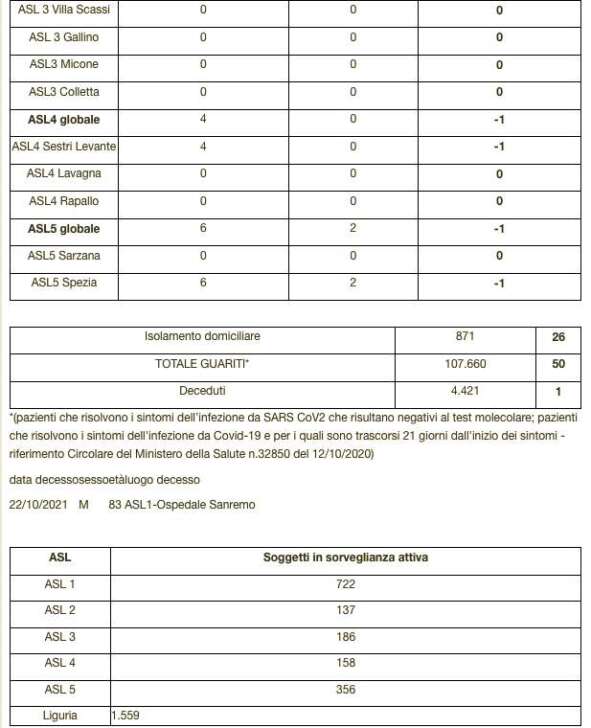 Sono 4.421 i morti con coronavirus con un aumento rispetto a quanto comunicato ieri da Regione Liguria di uno (maschio di 83 anni deceduto il 22 ottobre all’ospedale di Sanremo).
