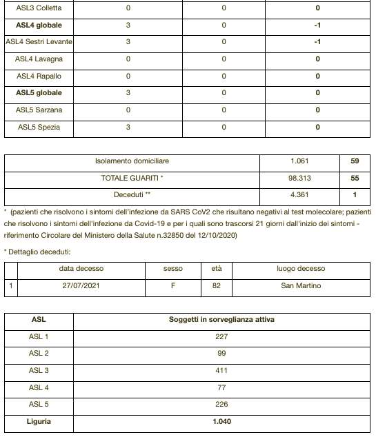 Sono 4.360 i morti con coronavirus con un aumento rispetto a quanto comunicato ieri da Regione Liguria di uno (femmina di 82 anni deceduta il 27 luglio al San Martino di Genova).