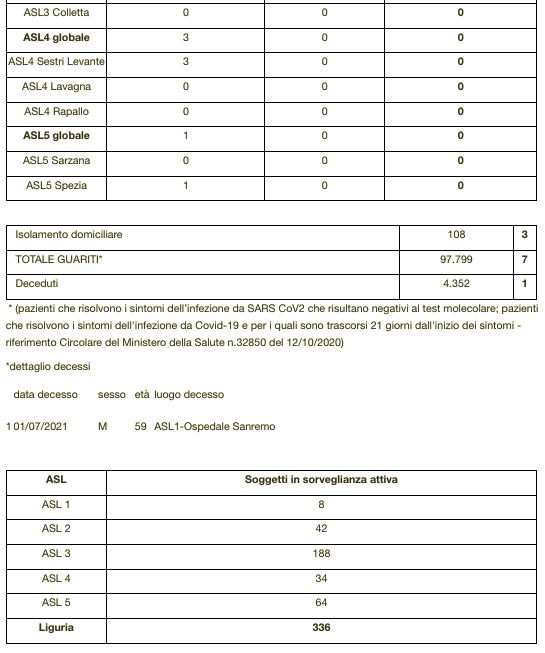 Sono 4.352 i morti con coronavirus con aumento rispetto a quanto comunicato ieri da Regione Liguria di uno (maschio di 59 anni deceduto il 1° luglio a Sanremo).
