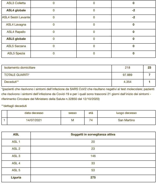 Ecco il bollettino di oggi con tutti i dati ufficiali inviati da Regione Liguria al ministero della Salute.