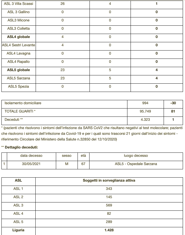 Sono 4.323 i morti con coronavirus in Liguria, con un aumento rispetto a quanto comunicato ieri da Regione Liguria di uno (maschio di 67 anni deceduto ieri a Sarzana).
