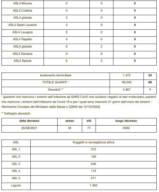 Genova, 7 agosto. Sono 4.367 i morti con coronavirus con un aumento rispetto a quanto comunicato ieri da Regione Liguria di uno (maschio di 77 anni deceduto il 5 agosto al San Martino di Genova).