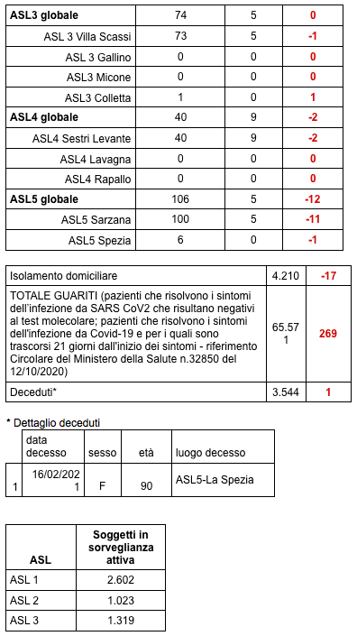 Sono 3.544 i morti con coronavirus in Liguria, con un aumento rispetto a quanto comunicato ieri da Regione Liguria di uno (donna spezzina di 90 anni).