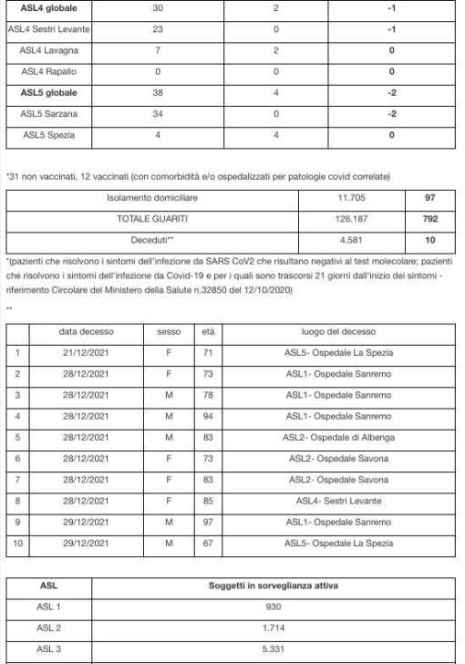 Sono 4.581 i morti con coronavirus con un aumento rispetto a quanto comunicato ieri da Regione Liguria di dieci (cinque femmine di 71, 73, 73, 83, 85 anni e cinque maschi di 67, 78, 83, 94, 97 anni).