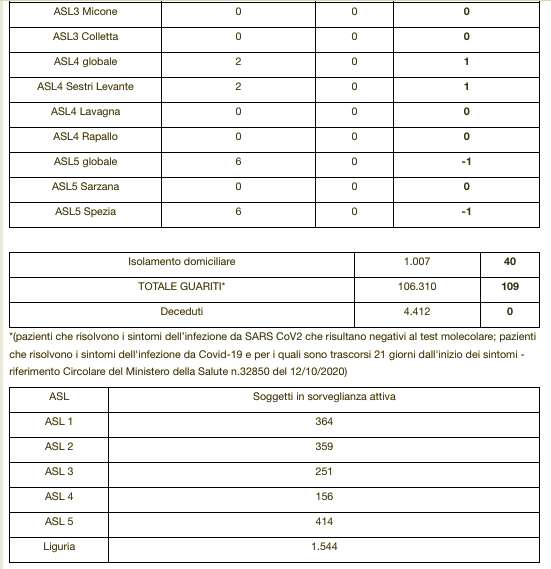 I flussi della Liguria sono stati allineati come indicatori dall’Istituto superiore di sanità includendo nei casi guariti, oltre ai pazienti che risultano negativi al test molecolare, anche quelli che risolvono i sintomi dell’infezione da Covid-19 e per i quali sono trascorsi 21 giorni dall’inizio dei sintomi previa valutazione di esperti clinici e microbiologi/virologi (riferimento Circolare del Ministero della Salute n. 32850 del 12/10/2020).