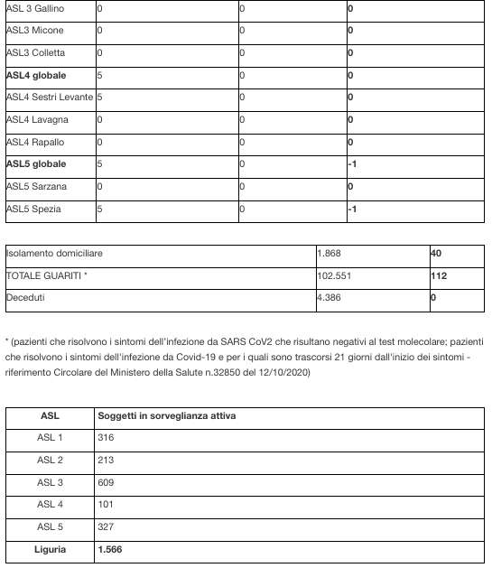 Ecco il bollettino di oggi con tutti i dati ufficiali inviati da Regione Liguria al ministero della Salute.