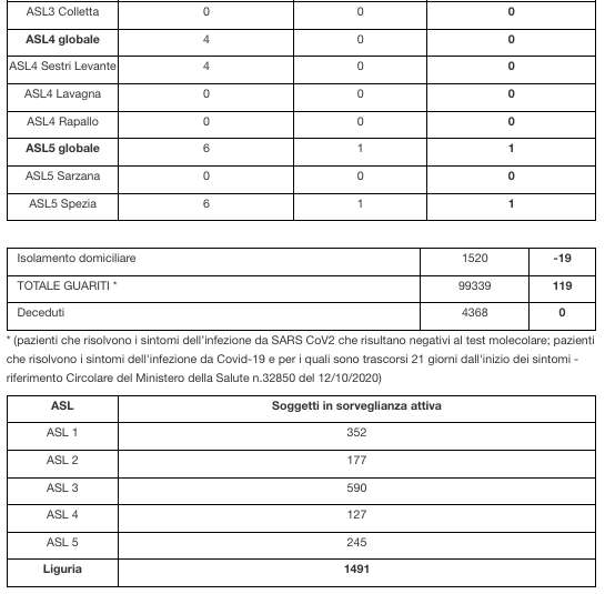 Ecco il bollettino di oggi con tutti i dati ufficiali inviati da Regione Liguria al ministero della Salute.