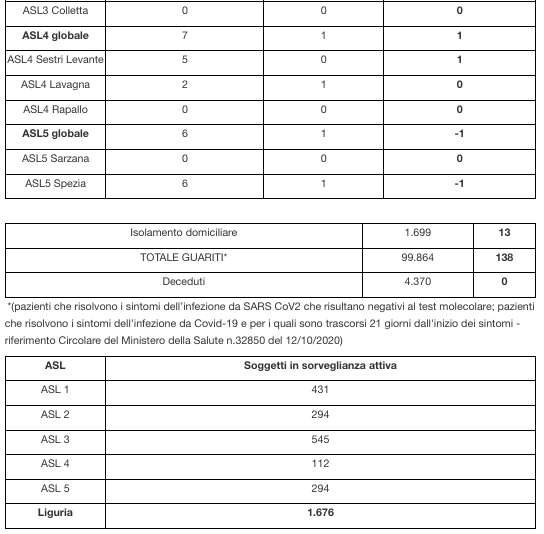 Ecco il bollettino di oggi con tutti i dati ufficiali inviati da Regione Liguria al ministero della Salute.