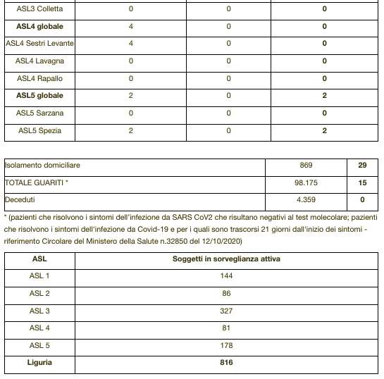 Ecco il bollettino di oggi con tutti i dati ufficiali inviati da Regione Liguria al ministero della Salute.