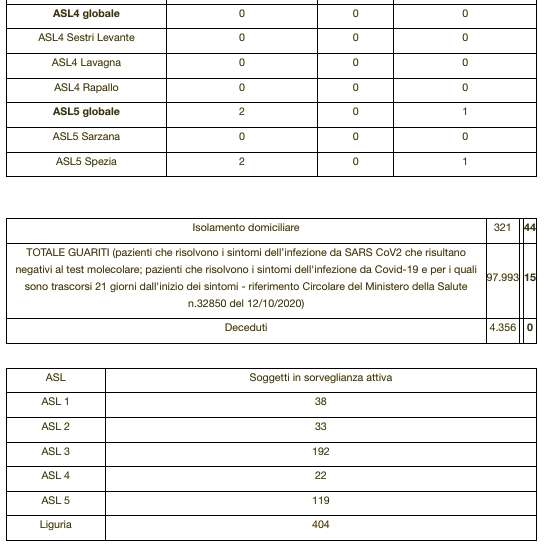 Ecco il bollettino di oggi con tutti i dati ufficiali inviati da Regione Liguria al ministero della Salute.