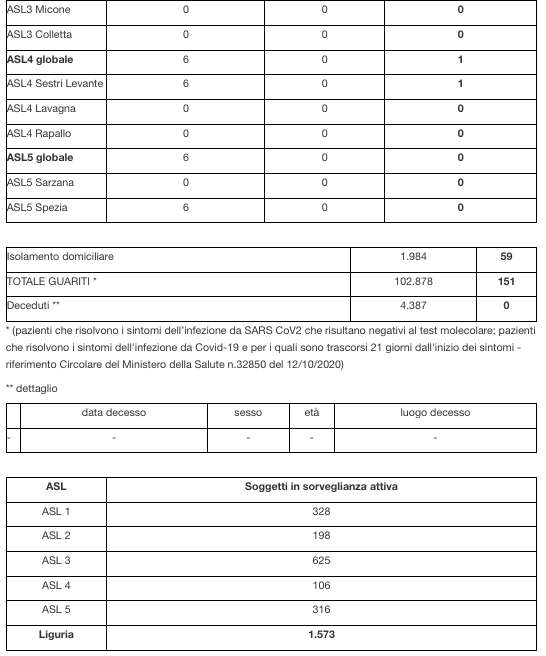 Ecco il bollettino di oggi con tutti i dati ufficiali inviati da Regione Liguria al ministero della Salute.