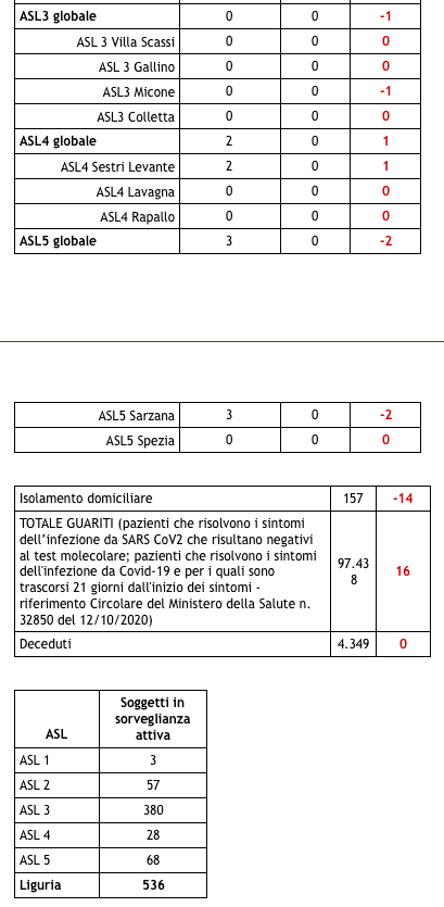 Ecco il bollettino di oggi con tutti i dati ufficiali inviati da Regione Liguria al ministero della Salute.