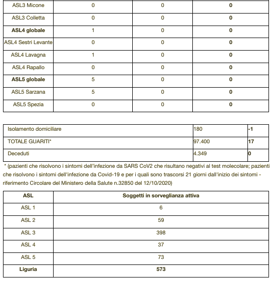 I flussi della Liguria sono stati allineati come indicato dall’Istituto superiore di sanità, considerando nei casi guariti, oltre ai pazienti che risultano negativi al test molecolare, anche quelli che risolvono i sintomi dell’infezione da Covid-19 e per i quali sono trascorsi 21 giorni dall’inizio dei sintomi previa valutazione di esperti clinici e microbiologi/virologi (riferimento Circolare del Ministero della Salute n. 32850 del 12/10/2020).