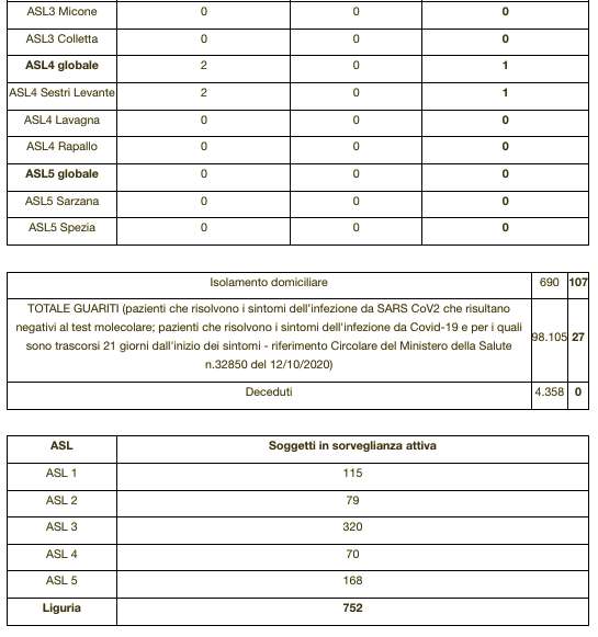 Ecco il bollettino di oggi con tutti i dati ufficiali inviati da Regione Liguria al ministero della Salute.