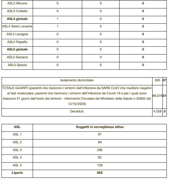 Ecco il bollettino di oggi con tutti i dati ufficiali inviati da Regione Liguria al ministero della Salute.