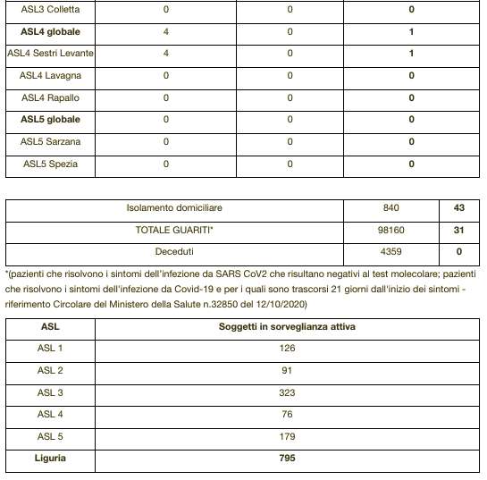 Ecco il bollettino di oggi con tutti i dati ufficiali inviati da Regione Liguria al ministero della Salute.
