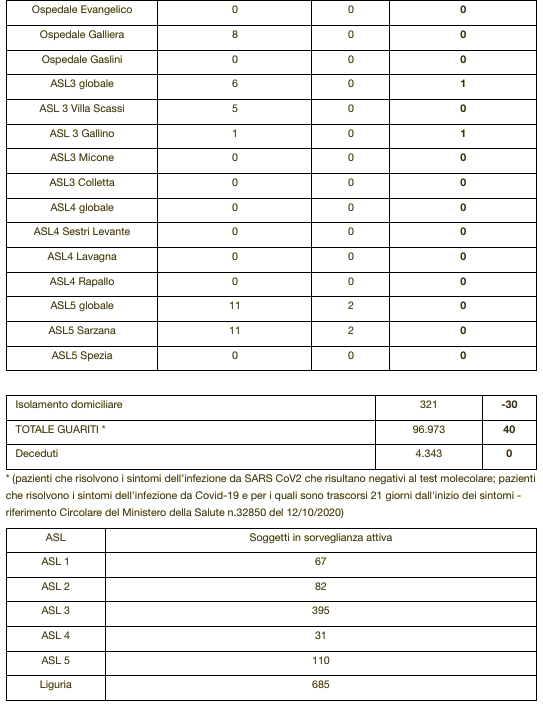 Ecco il bollettino di oggi con tutti i dati ufficiali inviati da Regione Liguria al ministero della Salute.