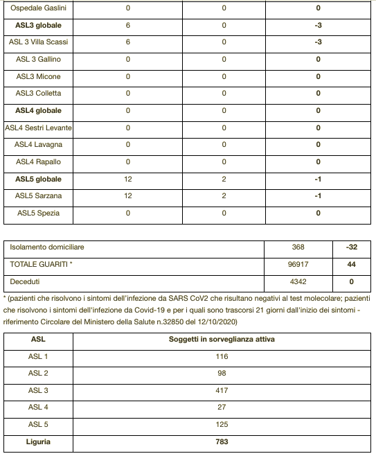 Ecco il bollettino di oggi con tutti i dati ufficiali inviati da Regione Liguria al ministero della Salute.