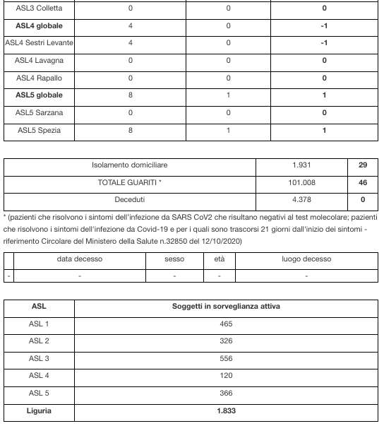 Ecco il bollettino di oggi con tutti i dati ufficiali inviati da Regione Liguria al ministero della Salute.