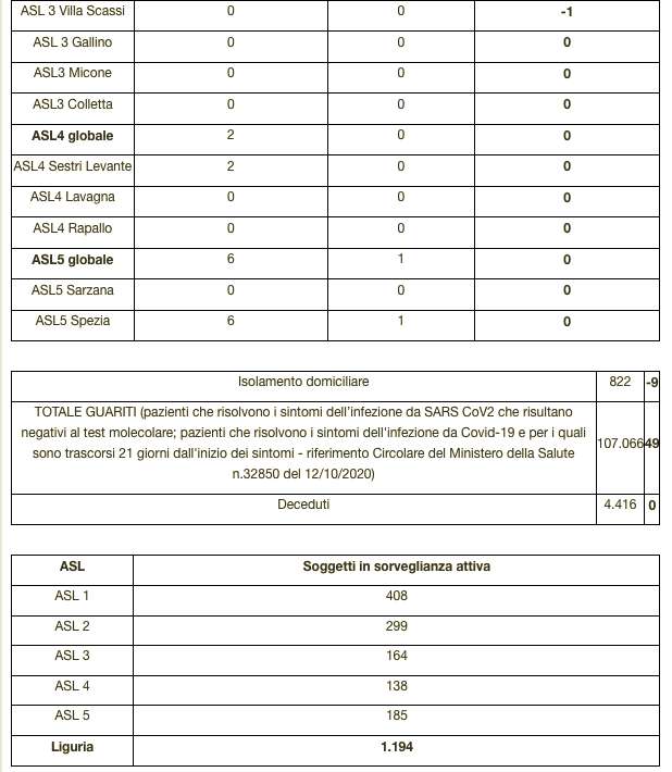 Ecco il bollettino di oggi con tutti i dati ufficiali della Regione Liguria al ministero della Salute.