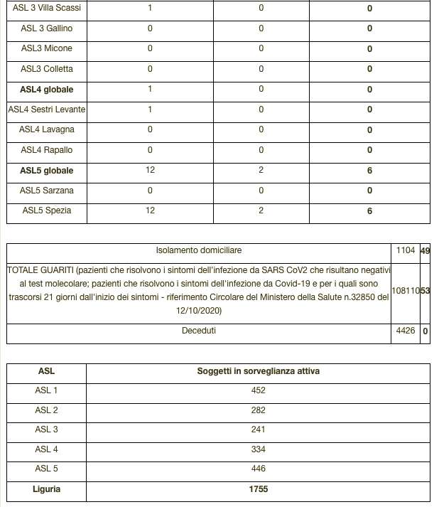 Ecco il bollettino di oggi con tutti i dati ufficiali della Regione Liguria al ministero della Salute.
