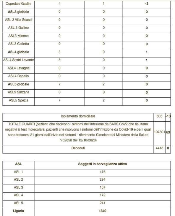 Ecco il bollettino di oggi con tutti i dati ufficiali della Regione Liguria al ministero della Salute.