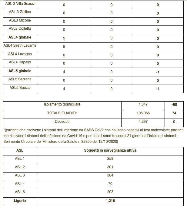 Ecco il bollettino di oggi con tutti i dati ufficiali della Regione Liguria al ministero della Salute.
