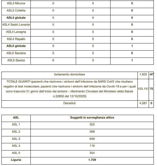 Ecco il bollettino di oggi con tutti i dati ufficiali della Regione Liguria al ministero della Salute.