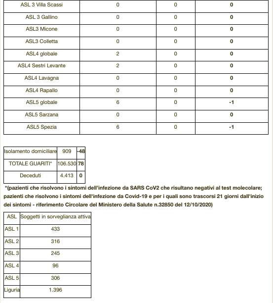 Ecco il bollettino di oggi con tutti i dati ufficiali della Regione Liguria al ministero della Salute.