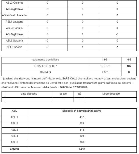 Ecco il bollettino di oggi con tutti i dati ufficiali inviati da Regione Liguria al ministero della Salute.