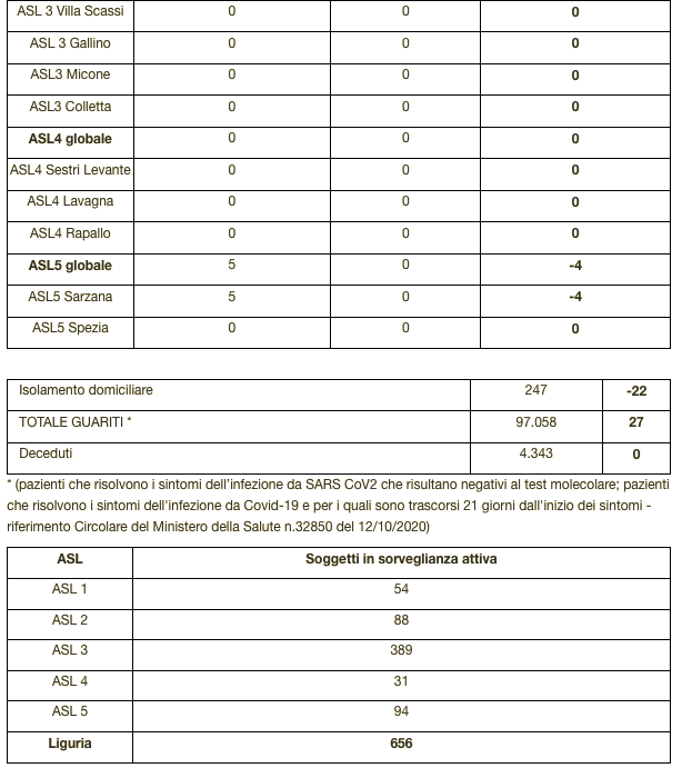 Ecco il bollettino di oggi con tutti i dati ufficiali inviati da Regione Liguria al ministero della Salute.