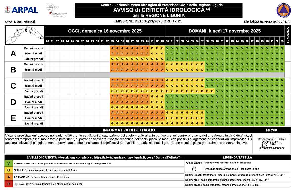 Il maltempo che sta interessando la regione Liguria prosegue anche domenica 16 novembre, con piogge intense e temporali soprattutto nel genovesato, successivamente estesi al Levante. ARPAL – con il supporto della Protezione Civile Regione Liguria – ha prorogato l’allerta arancione in diverse zone della regione, in considerazione dell’elevata umidità a tutti i livelli atmosferici e della persistenza del rischio in questione.