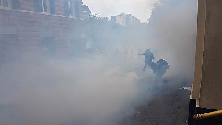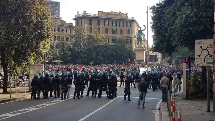 In un primo momento tutto è andato bene ed in modo pacifico con il lancio di slogan ‘Genova è solo Antifascista’ e simili. Purtroppo intorno alle 17:45, la situzione è degenerata quando un gruppo di antagonisti, con lo striscione ‘Genova Antifascista’ è entrato in via Palestro cercando di sfondare il blocco della polizia messa a difesa di piazza Marsala.